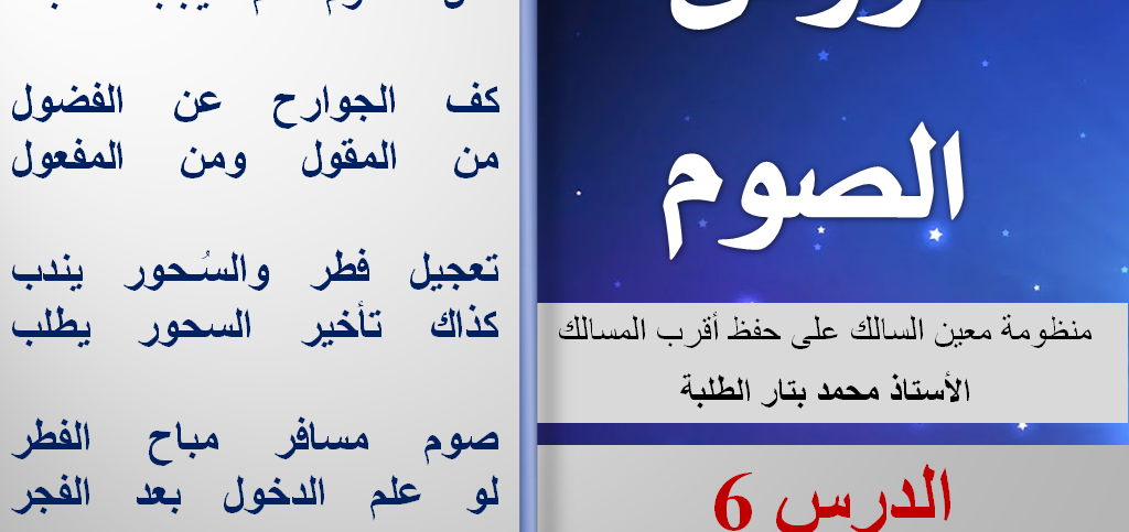 تعجيل ما يُقضى ووصلٌ تابعُه ككل صوم لم يجب تتابعُه كف الجوارح عن الفضول من المقول ومن المفعول تعجيل فطر والسُـحور يندب كذاك تأخير السحور يطلب صوم مسافر مباح الفطر لو علم الدخول بعد الفجر ملخص الدرس: من مندوبات الصوم: تعجيل قضاء رمضان ﻷن وجوبه على التراخي في سائر أيام … تابع قراءة الصوم “الدرس 6” – مندوبات الصوم – 2