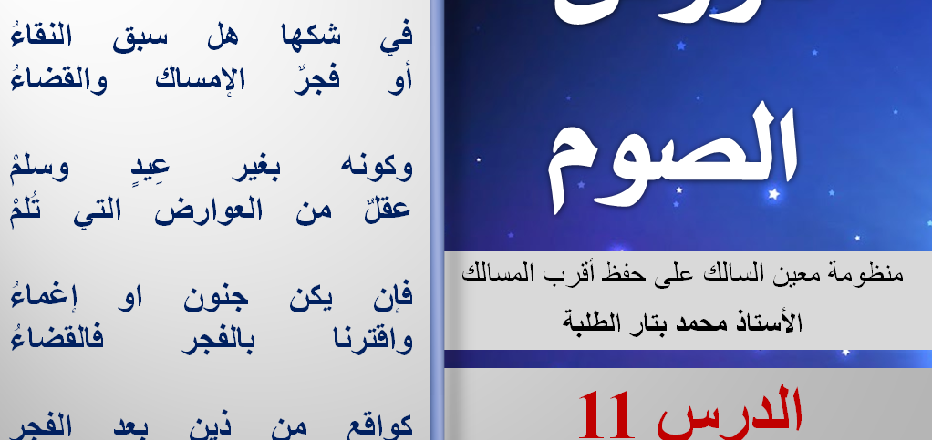 لِصحة الصوم النقا من الدم وإن بفجرٍ يتصلْ فلتَصُمِ في شكها هل سبق النقاءُ أو فجرٌ الإمساك والقضاءُ وكونه بغير عِيدٍ وسلمْ عقلٌ من العوارض التي تُلمْ فإن يكن جنون او إغماءُ واقترنا بالفجر فالقضاءُ كواقع من ذين بعد الفجر في جُلِّ ذاك اليوم لا في الشطر ملخص الدرس الحادي عشر … تابع قراءة الدرس 11 : شروط صحة الصوم