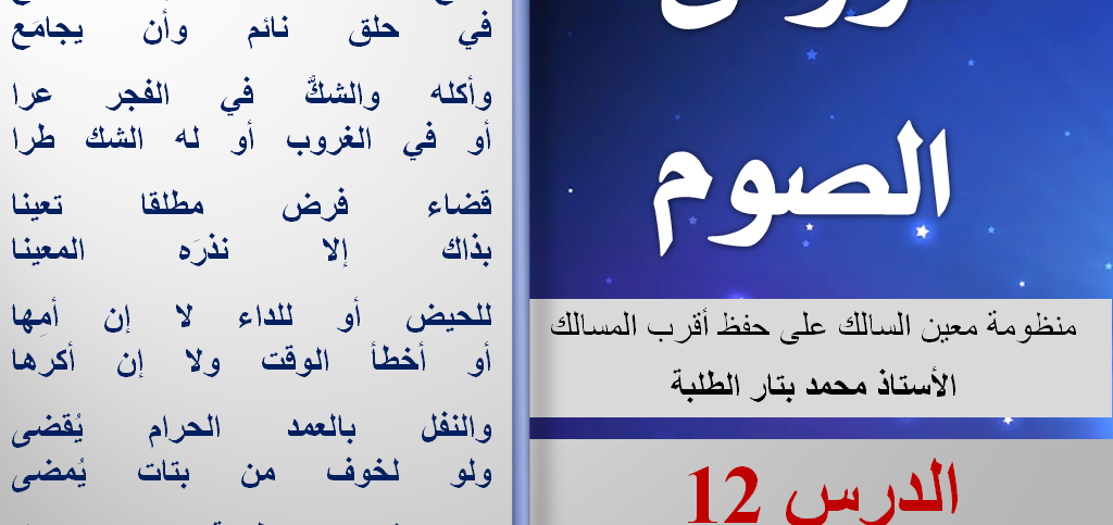 ويجب القضاء إن فطرٌ حصل للعذر أو بالركن صائم أخَل كرفع نية وصب مائع في حلق نائم وأن يجامَع وأكله والشكُّ في الفجر عرا أو في الغروب أو له الشك طرا قضاء فرض مطلقا تعينا بذاك إلا نذرَه المعينا للحيض أو للداء لا إن أمِها أو أخطأ الوقت ولا إن أكرها … تابع قراءة الدرس 12 : موجبات القضاء