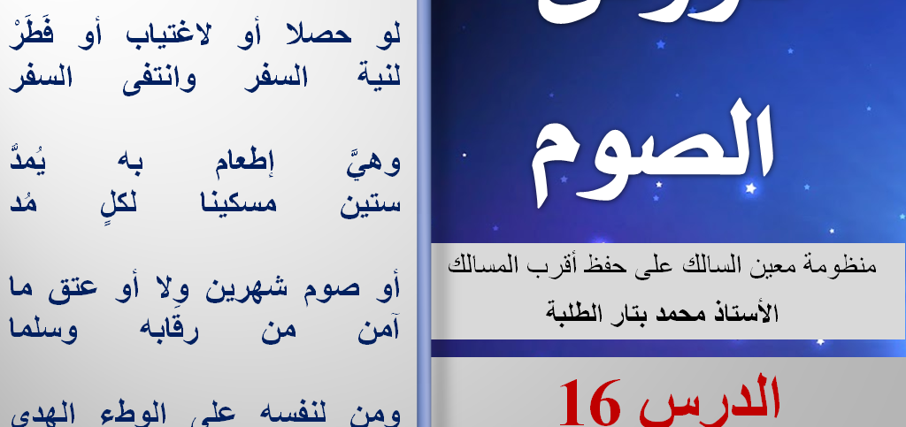 الصوم “الدرس 16” – منظومة معين السالك على حفظ أقرب المسالك / محمد بتار الطلبة